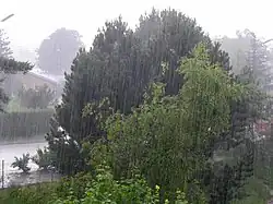 Según la definición oficial de la Organización Meteorológica Mundial, la lluvia es la precipitación de partículas líquidas de agua, de diámetro mayor de 0,5 mm o de gotas menores, pero muy dispersas. Si no alcanza la superficie terrestre, no sería lluvia sino virga y si el diámetro es menor sería llovizna.[1]La lluvia se mide en milímetros al año, menos de 200 son pocos, entre 200 y 500 son escasos, entre 500 y 1.000 son normales, entre 1.000 y 2.000 son abundantes y más de 2.000 son muchas.