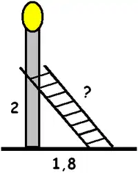 Imagina que hay una escalera recostada contra un poste. La punta de la escalera llega a una altura de 2 metros, y su base está alejada 1,8 metros de la base del poste (como en la imagen de la derecha). ¿Cuánto mide la escalera?