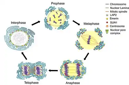 Nuclear envelope breakdown and reassembly in mitosis. At the end of G2, the activation of cyclin-dependent kinases, including CDK1, triggers entry into mitotic prophase. The nuclear membrane breaks down, and the NE-associate proteins either translocate to kinetochores, distribute with the fragmented ER networks, or dissolve in the cytoplasm. During NE reassembly in anaphase, SUN1 and LAP2 first appear around the condensed chromatin, though at different regions. The nuclear lamins then join the nuclear periphery in telophase. This figure illustrates the important roles played by the NE and the nuclear lamina in normal mitosis. Chi et al. Journal of Biomedical Science 2009.[1] During prophase in mitosis, the chromatids begin condensing to form chromosomes, and the nuclear envelope breaks down and is retracted into the mitotic endoplasmic reticulum. At metaphase, the nuclear envelope has been completely disassembled and absorbed by the ER allowing the chromosomes to be put together by spindle fibers attached to each chromosome at the kinetochore. Other eukaryotes such as yeast undergo closed mitosis, where the chromosomes segregate within the nuclear envelope, which then buds as the three daughter cells divide. In the process of mitosis, the nuclear envelope is degraded during prometaphase. Without this step, the nuclear material would be unable to separate into two nuclei, and by extension, two cells. At the end of anaphase however, the chromosomes are now separated, and each set is in its respective half of the parent cell. In order to protect the genetic material, the nuclear membrane must re-form at this stage. This is done using membrane from the endoplasmic reticulum and proteins called lamins that guide the new envelope. (Alberts) Like some of the other organelles in the cell, the endoplasmic reticulum is composed of a phospholipid bilayer. This thin membrane is very flexible, and portions can be pinched off to form new organelles, vesicles, or in this case, nuclei. In 2007, researchers discovered that pieces of the ER break off and merge to form the nuclear envelope. However, there must be a structural element that brings these vesicles together, because the nucleus is much more structurally complicated than the ER. This element is a layer of lamin between the chromatid and the nuclear envelope itself, known as the lamina. Lamins are long fibrous proteins. In prometaphase, they are phosphorylated (a phosphate group is added), causing the protein to change shape and lose its structural properties. This is what causes the breaking down of the nuclear membrane. However, towards the end of anaphase, the existing lamin is dephosphorylated, and even more is produced. Once the chromosomes have separated, the lamina begins to form again. Sometime at the beginning of mitosis, ends of the endoplasmic reticulum bound to the DNA, using lamin A receptor. (Duband-Goulet and Courvalin) Once the lamina begins to re-form, it forces tubules of ER to form a network across the surface of the chromatid. (Anderson and Hetzer) These tubes eventually are flattened out and merged, forming a solid nuclear membrane. It is not certain what mechanisms cause this to happen. The ER and the LBR eventually detach themselves from the DNA. In a mature cell, the lamina forms a continuous layer just inside the nuclear envelope, and is attached to the nucleus by protein known as emerin.[5]