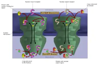 Ran is involved in the transport of proteins across the nuclear envelope by interacting with karyopherins and changing their ability to bind or release cargo molecules. Cargo proteins containing a nuclear localization signal (NLS) are bound by importins and transported into the nucleus. Inside the nucleus, RanGTP binds to importin and releases the import cargo. Cargo that needs to get out of the nucleus into the cytoplasm binds to exportin in a ternary complex with RanGTP. Upon hydrolysis of RanGTP to RanGDP outside the nucleus, the complex dissociates and export cargo is released.[38]