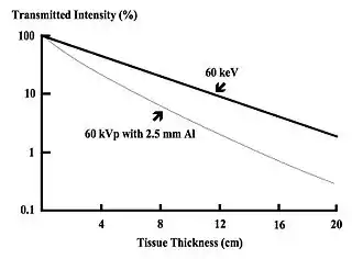 A consequence of using polychomatic X-rays is that the HVL for the range of energies needs consideration. As a result, the HVL for soft tissue in diagnostic radiography is different from that calculated in the table above, and is generally about 2.5 to 3 cm.