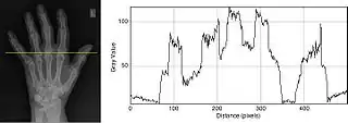 FFTs can also be calculated in two-dimensions to give results such as those in Figure 1.27. Since Fourier analysis generates results in terms of both positive and negative spatial frequencies, these can be plotted in the form of a 2D image so that the maximum frequency lies at the origin and those for the horizontal and vertical directions are shown increasing towards that origin. The modulation at different spatial frequencies is represented using a grey-scale. Low frequency bands can be seen along the horizontal axis in the figure, for example, representing the horizontal periodicity of image data from the fingers, while finer bands along the y-dimension are indicative of a periodicity of image data from the various metacarpophalangeal joints. Higher frequency features can also be seen running diagonally in this 2D-FFT, representative of the trabecular structure of the bones, for example.