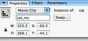 If you are going to be using ActionScript in your project, you will need to name the instances you will be targeting. Simply select the instance, go to the properties panel, and type in a new instance name. It is advisable to use plain English names that make sense. In the example, I named the instance 'cat_mc', because it is a cat. The '_mc' means that the instance is a movie clip symbol. There are standard extensions for each symbol type, such as _txt and _btn. While not strictly necessary, it is good form, and helps Flash give you the appropriate code hints.