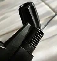 - Cable end terminals (anchors): The steel cables have welded end pieces (see image) that are shaped to fit into slots in shifters or brake levers and because cables are not interchangeable as to their purpose, there are three main types of inner-cable sold. A brake cable has either a barrel-shaped end, for bikes without drop-handlebars, or a pear-shaped end for the racing types with drop-handlebars. Cables for shifters have a button-shaped end. The free end of a cable is usually welded so that the wires cannot fray while the cable is being threaded through its housings. Some cables for brakes have a barrel at one end and a pear-termination at the other so that the user can discard the one that is not needed. These latter types are referred to as universal though the term is also used to describe some products that contain a complete brake or shifting kit that is long enough to fit most bikes.
