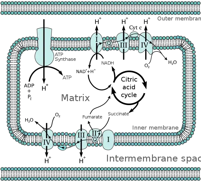 Electrons carried via NADH and FADH2 are transported to complexes some of which pumps H+ from matrix to intermembrane space. But passage between complexes also requires some electron carriers. These carriers are respectively Ubiquinone (Coenzyme Q, shortly just Q), Iron sulphur proteins and cytochromes.