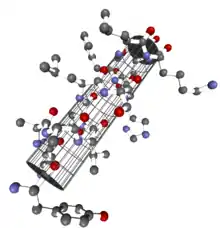 The amino acids in an α helix are arranged in a helical structure, about 5 Å wide. Each amino acid results in a 100° turn in the helix, and corresponds to a translation of 1.5Å along the helical axis. The helix is tightly packed; there is almost no free space within the helix. All amino acid side-chains are arranged at the outside of the helix. The N-H group of amino acid (n) can establish a hydrogen bond with the C=O group of amino acid (n+4).