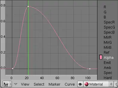 Note: In Blender 2.6, IPO curves no longer exist. Select the graph editor view to get the same capabilities. Also note that in the texture settings from the previous section you need to enable (and set to 1) the Alpha setting in the "influence" section, otherwise the Alpha animation will be applied to the particle system as a whole not to the individual particles. |