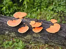 Fruiting bodies of a bracket fungus on a Christmasberry log