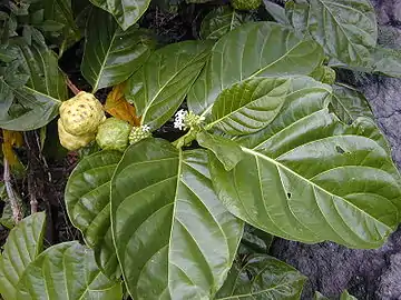 Noni (Morinda citrifolia) flowers and fruit. Note stages of progressive maturation shown from a cluster of flowers to an accessory fruit.