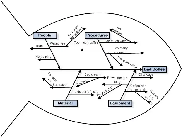 To construct a Fishbone Diagram, start with the problem you are addressing near the eye of the fish.  From there, identify the primary causes of the problem.  Typically, these are the 4 Ps or the 4 Ms, but can be what makes sense for the particular problem at hand.  The 4 Ps are People, Procedure, Policy and Plant.  The 4 Ms are Man, Machinery, Methods and Material.  A sample chart showing an example of why a cup of coffee “could” be bad is as follows: