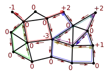 A set of basis closed surfaces for the shown graph. Any closed surface is a linear combination of the basis surfaces. A surface that wraps the bottom right node can be formed by adding all of the shown basis surfaces, and then reversing the orientation. A set of basis closed surfaces for the shown graph. Any closed surface is a linear combination of the basis surfaces. A surface that wraps the bottom right node can be formed by adding all of the shown basis surfaces, and then reversing the orientation.