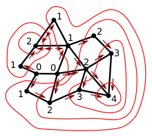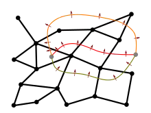 Each edge has 2 endings: and . With respect to node , let denote the set of all edge endings that connect to , excluding any edges that connect to nodes from . The set can now be partitioned into subsets according to the following equivalence relation: two edge endings belong to the same partition if and only if there exists a simple loop that is confined to the nodes and that visits node exactly once, arriving through or and leaving through the other ending. Let denote the partitioning of .