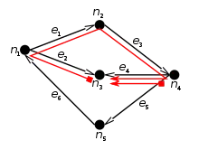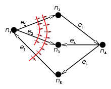 - The right image depicts the directed graph that model the electric circuit. The set of nodes is  and the set of edges is .