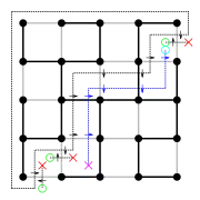 The discrete analog to paths using a directed graph is that a path is a series of edges and orientations: where is the edge and is an indicator that is if is traversed in the preferred direction, and is if is traversed in the opposite direction. The path must be unbroken: for each it must be that . The combined path denoted by is (path is path the orientation reversed) and the total length is .