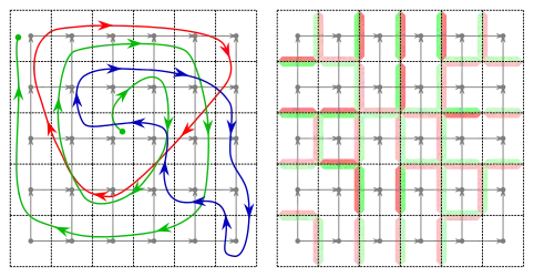 Below is shown two examples of a multi-path and the corresponding edge based function . On the left a superposition of multiple paths is shown. For each surface , the total "flow" through is computed and is then divided by to spread it out over the surface . On the right, the flow enters a surface through the green side and leaves through the red side. The density of the flow is depicted by the strength of the shading. If the green to red orientation coincides with the orientation of , then is positive. If the green to red orientation is opposite the orientation of , then is negative.