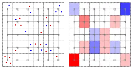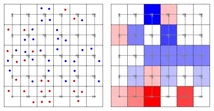 Below is shown two examples of a multi-point and the corresponding node based function . On the left, there is a collection of points with a weight of +1 denoted by red dots, and points with a weight of -1 denoted by blue dots. For each volume , the weights of all of the contained points are added together and the total weight is divided by to spread it out over the volume . On the right, shades of red denote positive values for , while shades of blue denote negative values for . White means that for the current node .