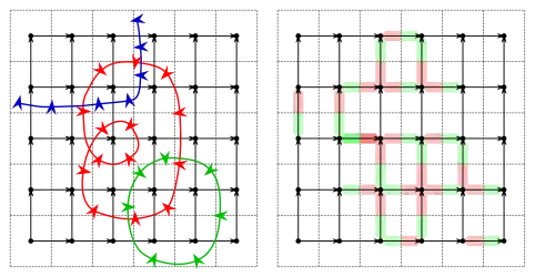 A non-closed surface, shown in blue, is the linear superposition of basis non-closed surfaces and a closed surface. Observe how the blue arrows on the edges are the sum of the black arrows (opposites cancel out). A non-closed surface, shown in blue, is the linear superposition of basis non-closed surfaces and a closed surface. Observe how the blue arrows on the edges are the sum of the black arrows (opposites cancel out).