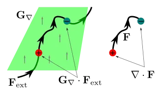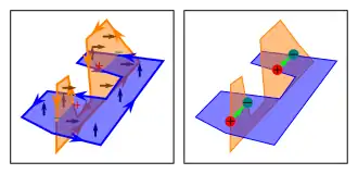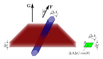 ![]() The intersection between a multi-path shown as a blue tube with a multi-surface shown as layers of red sheets. Vector F is the flow density through the blue tube. Vector G is the surface density in the red sheets. The green parallelogram is a 2D projection of the volume of the intersection. The intersection points become more dilute as the angle theta increases, so the intersection point density is the dot product of F and G. |