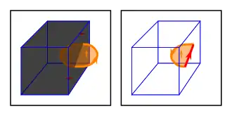 Consider a surface with weight from , and a volume with weight from . Let denote the counter-clockwise boundary of , and let denote the inwards oriented surface of . There are two sources for the counter-clockwise boundary of . Any time intersects , the intersection contributes to the boundary of . When leaves , the boundary of cannot follow, and instead must trace along the surface of while remaining in the surface as indicated in the image to the right. The boundary of the total intersection , denoted by , consists of two parts: the intersection of the boundary of with , denoted by , and the intersection of the inwards-oriented surface of with , denoted by . Therefore: .