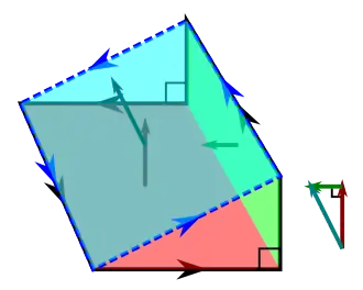 ![]() In this image there are two surfaces. The first surface is the union of the red and green planes, and the counter-clockwise boundary is shown by the thick black line. The second surface is the blue plane and the counter-clockwise boundary is shown by the dashed blue line. The surface vectors of the red, green, and blue planes are shown. The total surface vector of the first surface is the sum of the surface vectors of the red and green planes, and is equal to the surface vector of the blue plane. This all implies that the total surface vector of a sloped flat surface is unchanged by replacing the surface with its horizontal and vertical components (projections). |