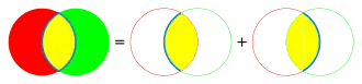 Consider a volume with weight from , and a volume with weight from . Let denote the inwards-oriented surface of , and let denote the inwards-oriented surface of . There are two parts to the inwards-oriented surface of the intersection , as shown in the image to the right. Part of the surface of consists of the portion of that is contained by , which contributes the term to . The other part of the surface of consists of the portion of that is contained by , which contributes the term to . Therefore the total surface of is .