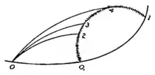 If, on the other hand, along the whole curve , then this curve must consist of several cycloidal arcs ; since, if it were only one, the curves and would be identical. These arcs must have different tangents at the point where they come together ; for, since this point cannot lie on the -axis, a consecutive point having the same direction must lie on the same cycloidal arc. If corners were present, however, they could be so rounded off that there would be a shorter path between the two points, and consequently, the velocity being the same, the time of falling would be shorter.