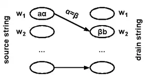 There is a link from a source node to a drain node if string overlap with string shifted right by one symbol. This means that the overlapping source substring ( without the start symbol ) is equal to the overlapping drain substring ( without the end symbol ).