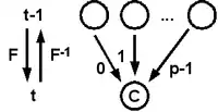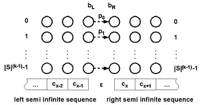 For the diagram to be easier to read and use on cellular automata this book uses a diagram representation, where all the nodes are drawn twice. Nodes on the left are source points of links and nodes on the right are drain points of links. The direction of the links is chosen to point in the increasing direction of cell position indexes.