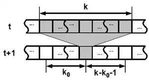 Explicitly defined boundaries are less common as the simple constant values are useful only for CA where we observe events on a quiescent background with period 1. The boundary can be defined as a single set (the left and the right part combined) of cell values of length (there is no boundary cell with index 0)