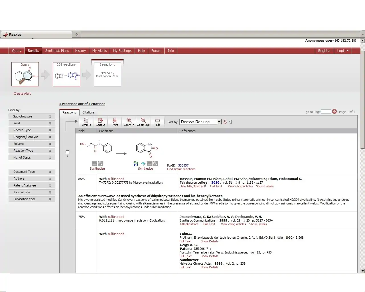 Reaxys Structure Editing Screen with Isatin Molecule (above) and Two of the Search Results (below)