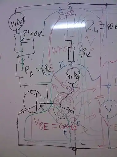 Then what does a transistor actually do? Well, look at the last picture (on the left) of your colleagues from the previous Group 66b. As you can see, we have drawn arrows going out of the transistor. They represent the heat that the transistor was dissipating since they were made a short connection in the collector circuit. So, I ask you again, "What does the transistor do? As you can see, we have broken the three-terminal transistor into two 2-terminal devices and now we discuss the one of them - the output collector-emitter "device". Here is this "device", I have held it. It has two leads and it is connected by these two leads in an electrical circuit... I ask you again, "What does it do in this circuit?", "What does the transistor do with its output part?"