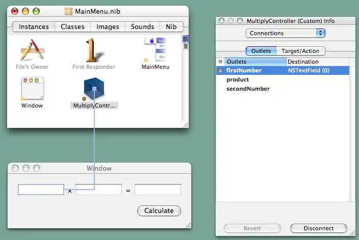 Now you need to connect all the parts up. To do this you need to click on the "Instances" tab of the "MainMenu.nib" window. Then hold down control on your keyboard and drag from the instance of "MultiplyController" to the first textfield in your application window. A blue line will appear showing the connection you are making. Once you have reached the first textfield stop dragging and the info window will show you the possible outlets to connect. Choose "firstNumber" and then click "Connect". The screenshot shows the situation just after the connection has been made, hence the button in the inspector window now shows "disconnect", and there is a ball next to the firstNumber outlet showing that it is the target of the connection illustrated by the illustration on the left.