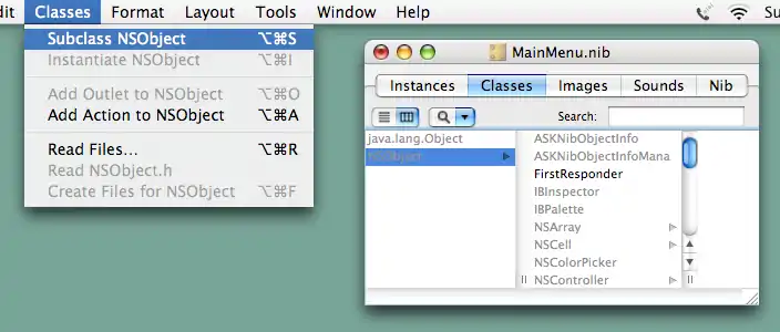 But how do these items work together? At the moment the textfields and button aren't connected in any way. We will connect them to an controller object that we shall now create. Click on the "Classes" tab of the "MainMenu.nib" window and choose "NSObject" (it's all the way to the left). With NSObject selected choose "Subclass NSObject" from the "Classes" menu.
