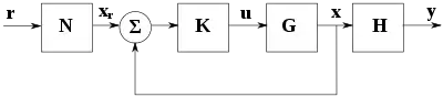 The idea of the system above with a linear feedback and no reference input is to drive the system state vector to zero. If we have a system reference input r, we can define a vector N that is the desired value for our state. This combined input is equal to: