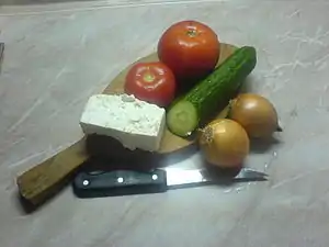 - Cut the tomatoes, cucumbers and peppers in small pieces, cubes if possible.