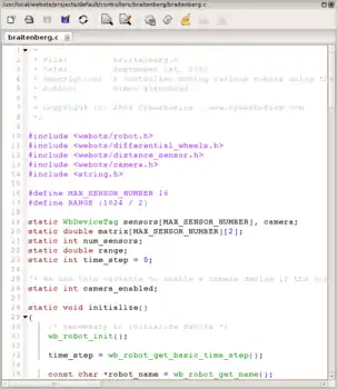 Until now, you have programmed the robot behavior by using BotStudio. This tool enables to program quickly and intuitively simple behaviors. Probably you also remarked the limitations of this tool in particular that the expression freedom is limited and that some complex programs become quickly unreadable. For this reason, a more powerful programming tool is needed: the C programming language. This programming language has an important expression freedom. With it and the Webots libraries, you can program the robot controller by writing programs. The problem is that you have to know its syntax. Learning the C language is out of the focus of the present document. For this reason, please refer to a book about the C programming. There are also very useful tutorials on the web about this subject like those wikibooks on C programming