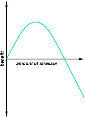 Figure 7: The hormetic response curve. Note how small amounts of the stressor event have a positive effect, but which decreases rapidly as the amount increases. Large amounts will actually have a negative effect on the body. (The stressor event can be exercise, radiation, or any other agent for which there is a hormetic response).