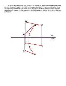 A locus(loci) is a solution(s) that satisfy a given set of conditions. [[[[Media:|thumbnail]]]] Depending on the situation, the locus can be a different solution. In Figure A, there is a vertical axis BO and a point a. When point a is revolved around BO, the path that point a creates is a circle. In this given set of conditions, the locus is the circular path that point a creates when revolved around BO because that circle is a collection of all the points that are the same distance from BO as point a. In Figure B, there is a vertical axis BO with a line segment AO touches BO to creates ∠AOB. When AO is revolved around BO, the path that the AO creates a surface that takes the shape of a cone. Therefore, in this particular set of conditions, the locus AO is a conical surface because that surface is a collection of all the line segments that can be represented by AO in a three-dimensional space.