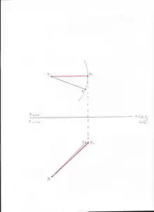 - Measure the length AB (in R view) and make a circle of radius AB with the center at the Axis. the point where it intersects the circle with radius (B-Axis) is B1 in R view.