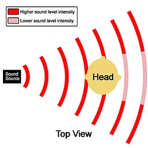 As the frequency increases above 1600 Hz, the dimension of the head is greater than the wavelength of the sound wave. Phase delays no longer allow to detect the location of the sound source. Hence, the difference in sound level intensity is used instead. Sound level is inversely proportional to the source-receiver distance, given that the closer you are to the emitting sound, the higher the sound intensity. This is also influenced greatly by the acoustic shadow cast by the head. As depicted in Figure 3, the head blocks sound, decreasing the sound intensity coming from the source[4].