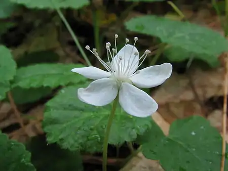 Dalibarda has been treated as a monospecific genus, but the Flora of North America Editorial Committee (2014)[1] treats it as a subgenus of Rubus. Its leaves superficially resemble those of violets, but its flowers and fruit are clearly rubusesque.