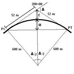 The distance between the PI and the vertex of the curve can be easily calculated by using the property of right triangles with and . Taking this distance and subtracting off the curve radius , the external distance , which is the smallest distance between the curve and PI, can be found.