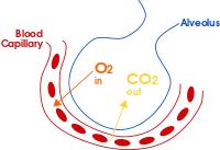 - Oxygen (required for respiration) enters the blood through capillaries next to air sacks in the lungs (alveoli) by diffusion