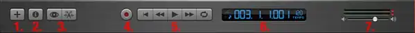 4. This is the record button. When pressed GarageBand will start recording either what is played with a USB keyboard or what is plugged into the sound input of the computer such as a guitar or microphone.