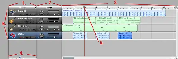 5. This is the cursor. This is from where GarageBand plays back your song when you press "play". Reposition it to make the song play from a different place or use the buttons in the 'buttons bar' below.