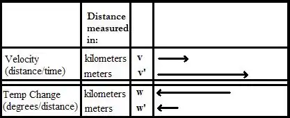 Imagine that you are driving a car at 100 kilometers per hour to the east, or along the positive x-axis. We shall call your velocity vector v. For now, we will keep the vectors one-dimensional. Suddenly you realize that you are in a meter-ish mood and so we want to figure out how fast you are going using meters instead of kilometers. Quickly changing your coordinate system, you find that you are traveling 100 * 1000 = 100 000 meters per hour easterly. We will call this vector v'. No problem.