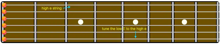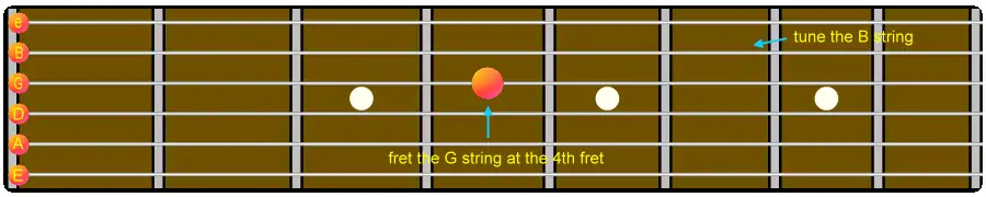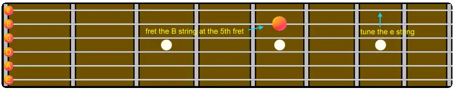 The fretboard diagram below shows the pairs of harmonics that are used. You start by tuning the harmonic on the 7th fret of the A string to the harmonic on the low E string. Then the harmonic on the 7th fret of the D string is tuned with the harmonic on the 5th fret of the A string. Tuning the G string to the D string is done in the same manner. Tune the harmonic on the B string to the harmonic on the 4th fret of the G string. Tune the harmonic on the e string to the harmonic on the B string.