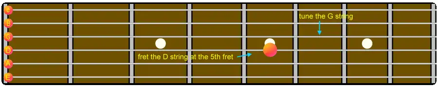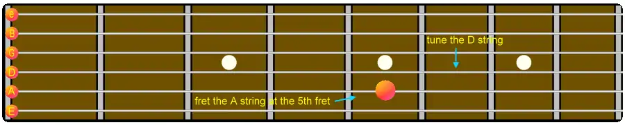 This method of tuning uses harmonics. By lightly touching a string directly above its fret-wire the fundamental of a note is silenced leaving only a series of overtones. Any note played on any instrument consists of a fundamental and a harmonic series of overtones. The twelfth, seventh and fifth nodes are the easiest frets with which to sound harmonics. After striking the string the finger should be removed quickly to produce the harmonic.
