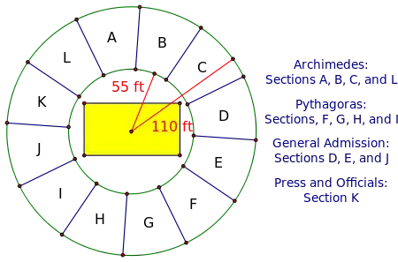 - The state championship game is to be held at Ray Diaz Memorial Arena. The seating forms a perfect circle around the court. The principal of Archimedes High School is sent the following diagram showing the seating allotted to the students at her school.