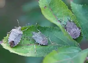 Halyomorpha halys, the brown marmorated stink bug, is an agricultural pest that can cause widespread damage to fruit and vegetable crops. In Japan it is a pest to soybean and fruit crops. In the U.S., the brown marmorated stink bug feeds on a wide range of fruits, vegetables, and other host plants beginning in late May/early June including peaches, apples, green beans, soybeans, cherry, raspberries, and pears. It is a sucking insect that uses its stylet to pierce the host plant in order to feed. This feeding results, in part, in the formation of small, necrotic areas on the outer surface of fruits but ranges from leaf stippling, cat-facing on tree fruits, seed loss, and transmission of plant pathogens.